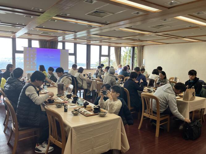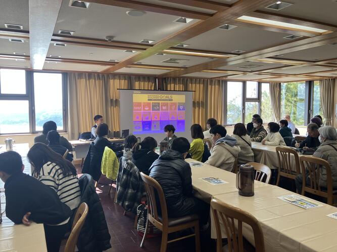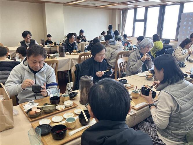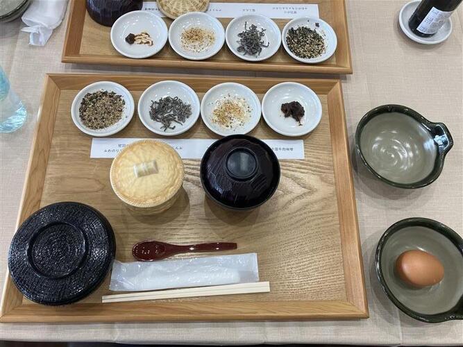 阪本鶏卵・水島工場にて養鶏場から届いた卵の洗浄や選別の様子を見学し、併設の直売所にてお買物。この日は年に1度の「大寒たまご」を取り扱っている日で、参加者の皆さんは「健康長寿」や「金運アップ」を願ってお買物も楽しまれていました。その後は、鷲羽山レストハウスに場所を移し、この日のための特別メニュー「阪本鶏卵の卵を使用した たまごかけごはん定食」の昼食を。副菜には阪本鶏卵の卵液を使用した茶碗蒸し、薬味には瀬戸内海産ののりや千屋牛の肉みそなど地元の素材を使ったメニューをご用意。何杯もお代わりをして、阪本鶏卵のこだわりの品質と味を堪能しました。お食事の後は、阪本鶏卵・阪本社長による自社の取り組みを講義形式で紹介。阪本鶏卵の地域にを大切にする取り組みや、環境に配慮した取り組みを学び、SDGsについて考えました。