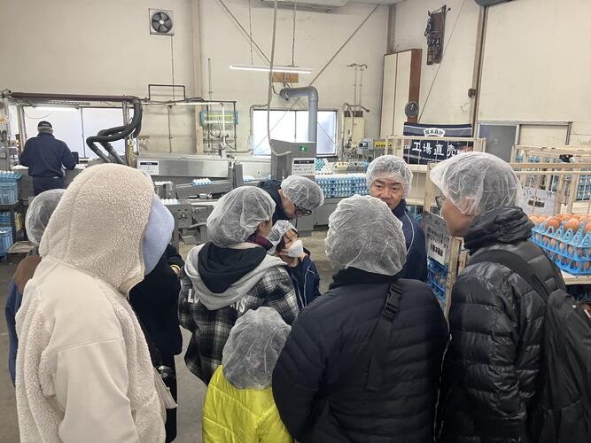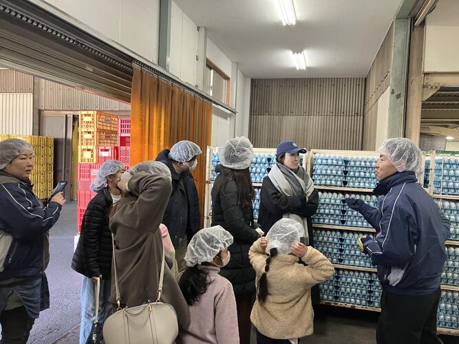まず最初に本社工場の見学。養鶏業で岡山県が全国3位としって驚き、普段見ることのない生まれたての卵の色やにおい、繊細な卵を選別する最新機械に驚き、興味津々で見学いただきました。午後の講話では、阪本鶏卵さんが取り組む循環型畜産業のお話を。地域の農家さんから飼料を仕入れ、自社の養鶏場で出た鶏の糞を肥料として地域の農家さんに提供したり、卵の殻を紙として再資源化して名刺として使用されていたり、目からうろこの取り組みを学び、参加者の方々もお話に聞き入っていました。昼食に出したこのツアーの特別メニュー「阪本鶏卵のたまごかけごはん」も大好評。子供から大人まで何度もおかわりして、地元の食材を使った薬味で味変して楽しみながら味わっていただけました身近な卵のさらなる魅力を知っていただけたのではないかと思います。そして訪問した日は年に1度の「大寒たまご」をの販売期間中!みなさん健康長寿と金運アップを願ってたくさんお土産を購入し、卵で大満足な一日となりました。阪本社長、ご参加くださった皆さん、ありがとうございました!