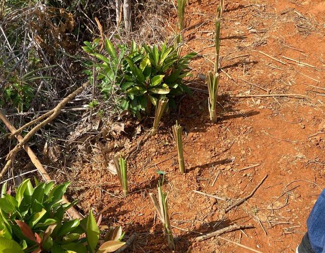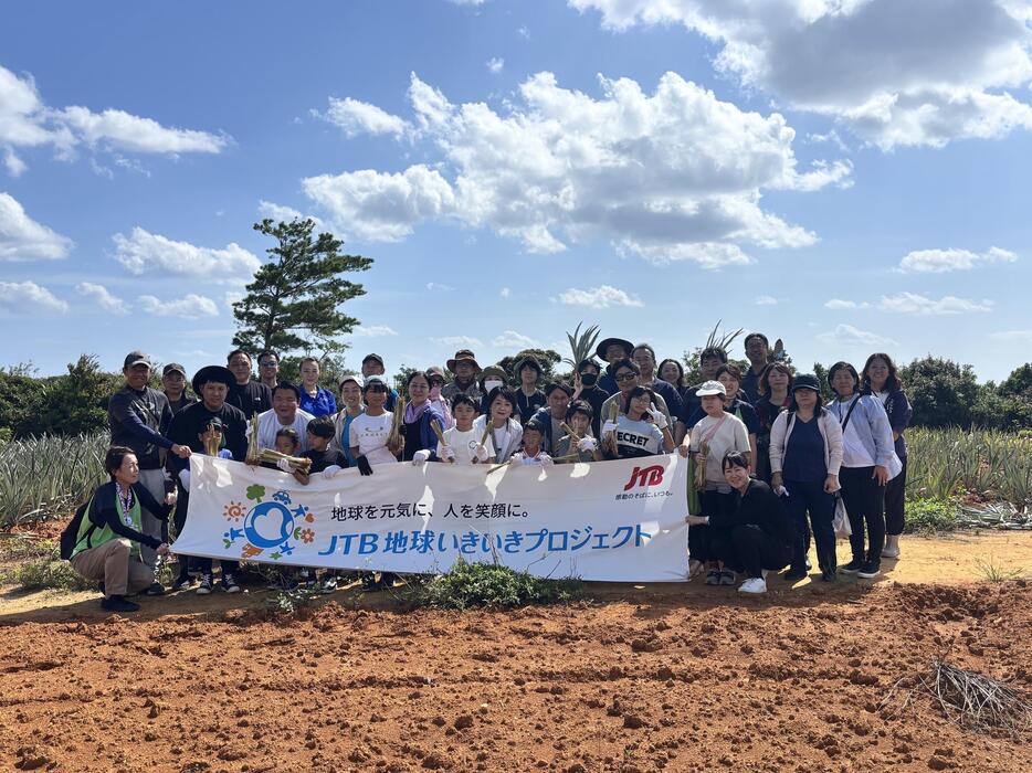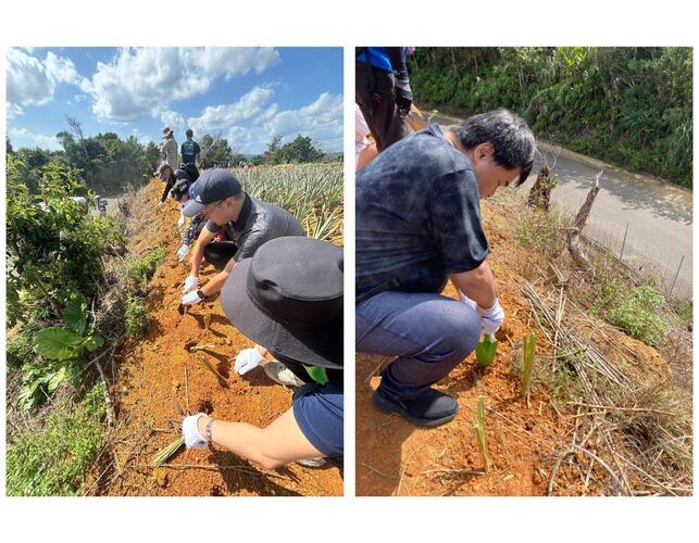 This time, with the cooperation of NPO Okinawa Green Network and Higashi Village Regional Council for Red Soil and Sediment Runoff Prevention, we carried out a planting activity using vetiver grass (from the Poaceae family) as a measure to prevent red soil runoff. Prior to the activity, we learned basic knowledge about the mechanism and impact of red soil runoff, and the expected environmental conservation effects of these countermeasures. Afterwards, we engaged in the actual planting work.