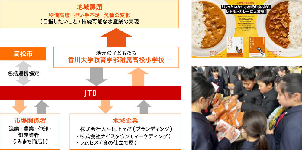 この見学を契機に、高松市・JTB・香川大学教育学部附属高松小学校を中心とした産官学の連携がスタート。半年間にわたり、地域の水産・農業の現場を知り、フードロス削減や持続可能な地域づくりについて議論を重ね、地域の“クセのある”食材を活用したレトルトカレーの共同開発に挑戦しました。