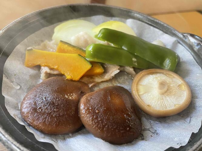 ・昼食、「万千百園」で大分の特産品しいたけ陶板定食を堪能
