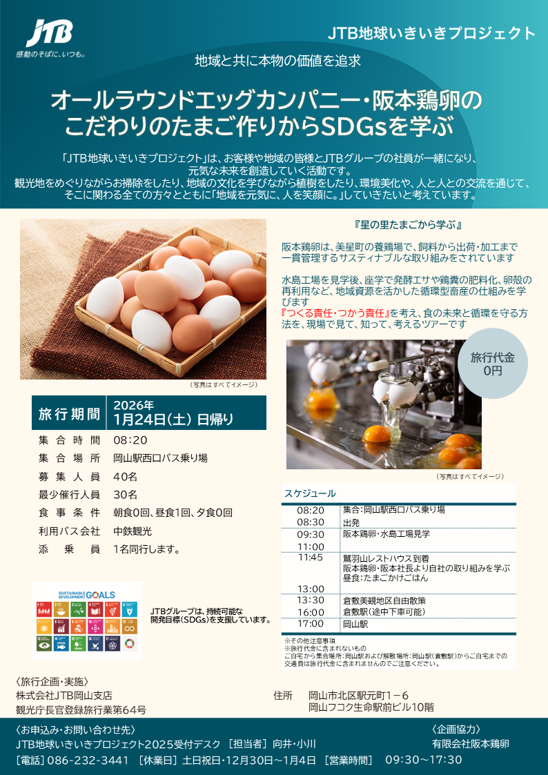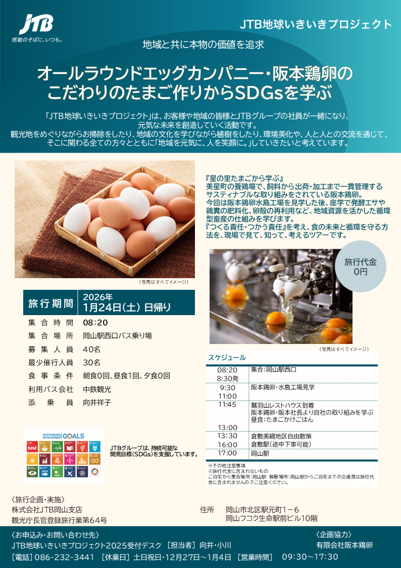 今回は阪本鶏卵水島工場を見学した後、座学で発酵エサや鶏糞の肥料化、卵殻の再利用など、地域資源を活かした循環型畜産の仕組みを学びます。『つくる責任・つかう責任』を考え、食の未来と循環を守る方法を、現場で見て、知って、考えるツアーです。- 協力団体