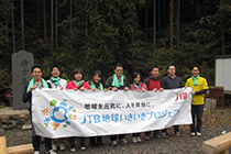当初予定を変更し、持方地区の取り組みの一つ「すいふ恵海の森事業」との共催で植樹や清掃を実施。紅葉の奥に男体山を望める、絶好の日和でした。昼食時は手作りこんにゃくの天ぷらなどの名物料理も並び、参加者の皆様は大満足のご様子でした。常陸太田市とJTBで実施予定の「持方自然学校」のPRもでき、地域にも、参加された皆様にも意義のある活動になったと思います。